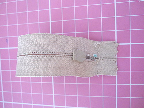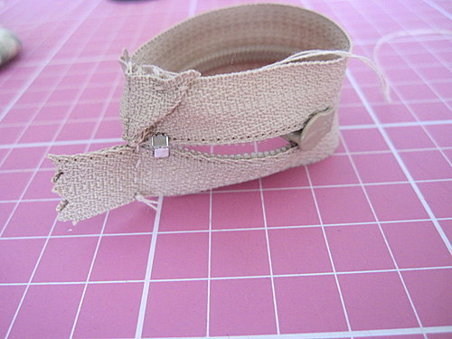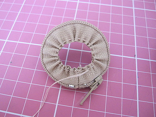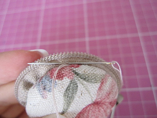 將剛縫好的包釦,放到拉鍊上,用藏針縫縫一圈
