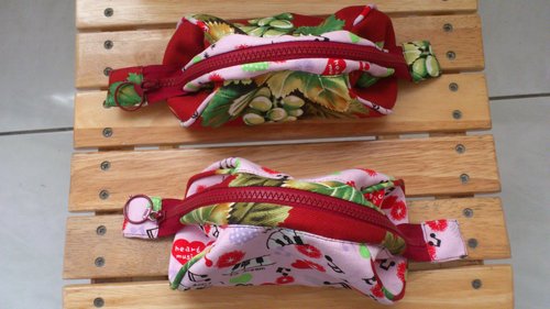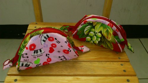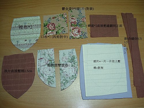 左二:包釦3.5mm,拉鍊12.5cm,表布7cm,裡布6cm,舖棉4~6cm,塑膠版3.3cm